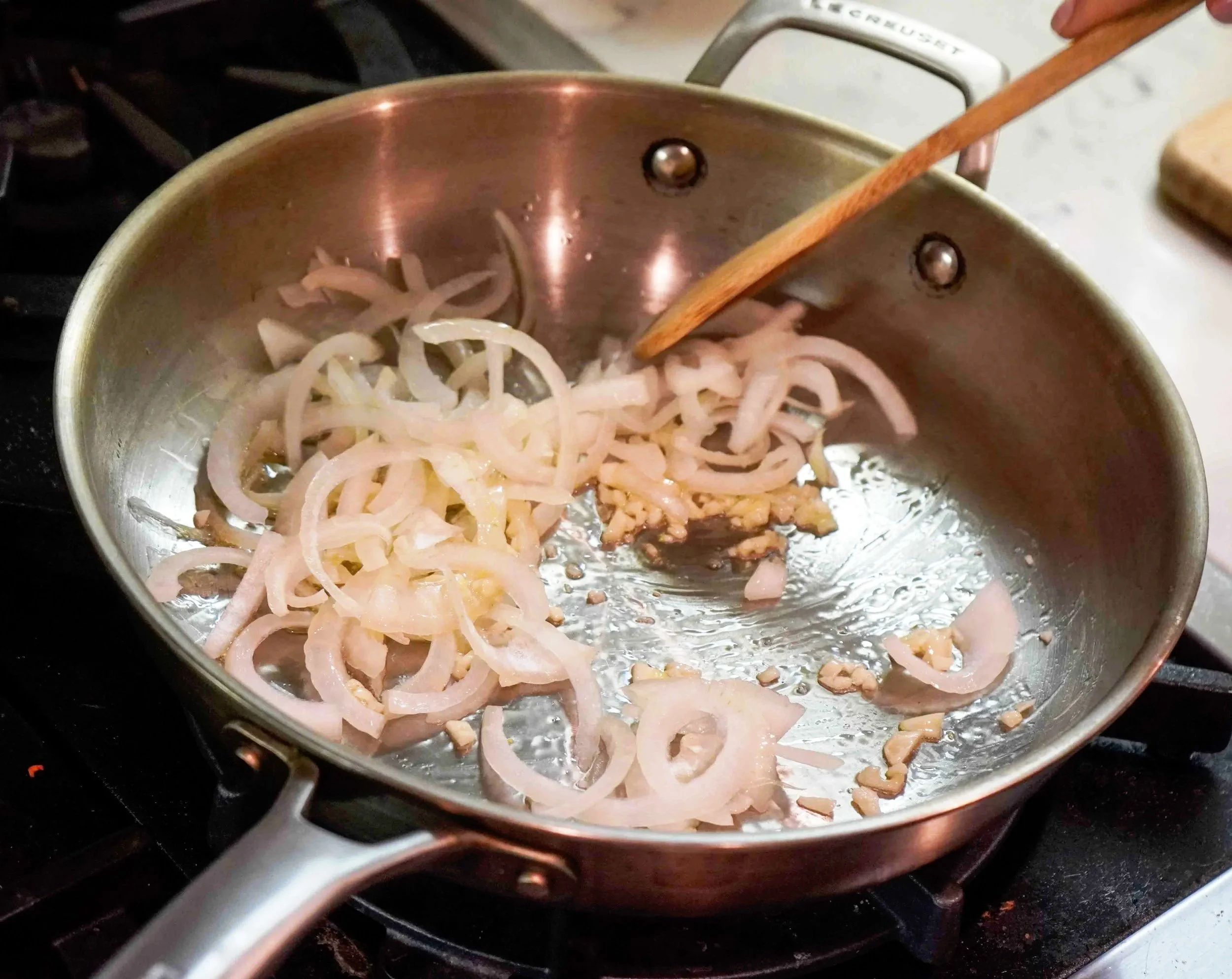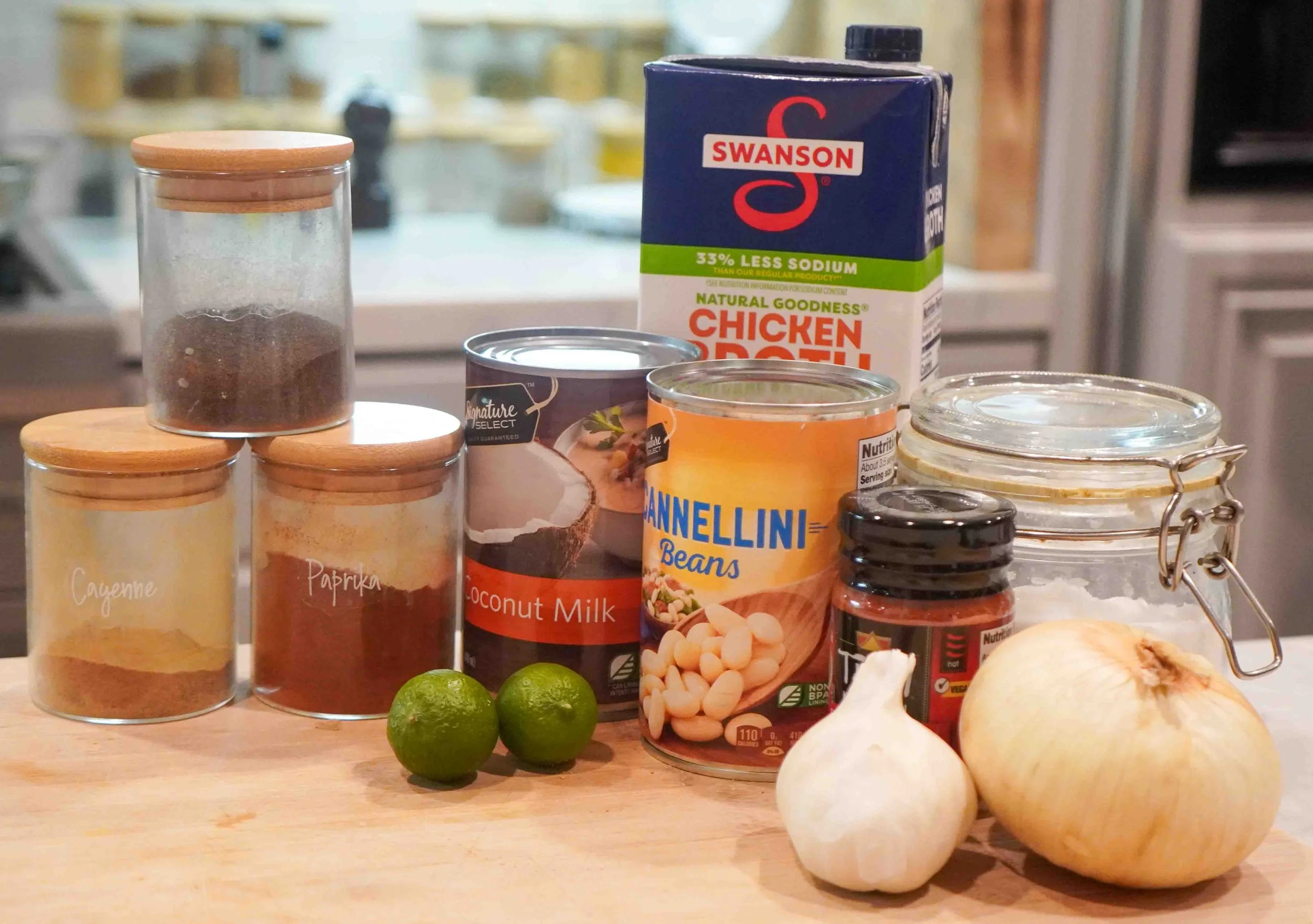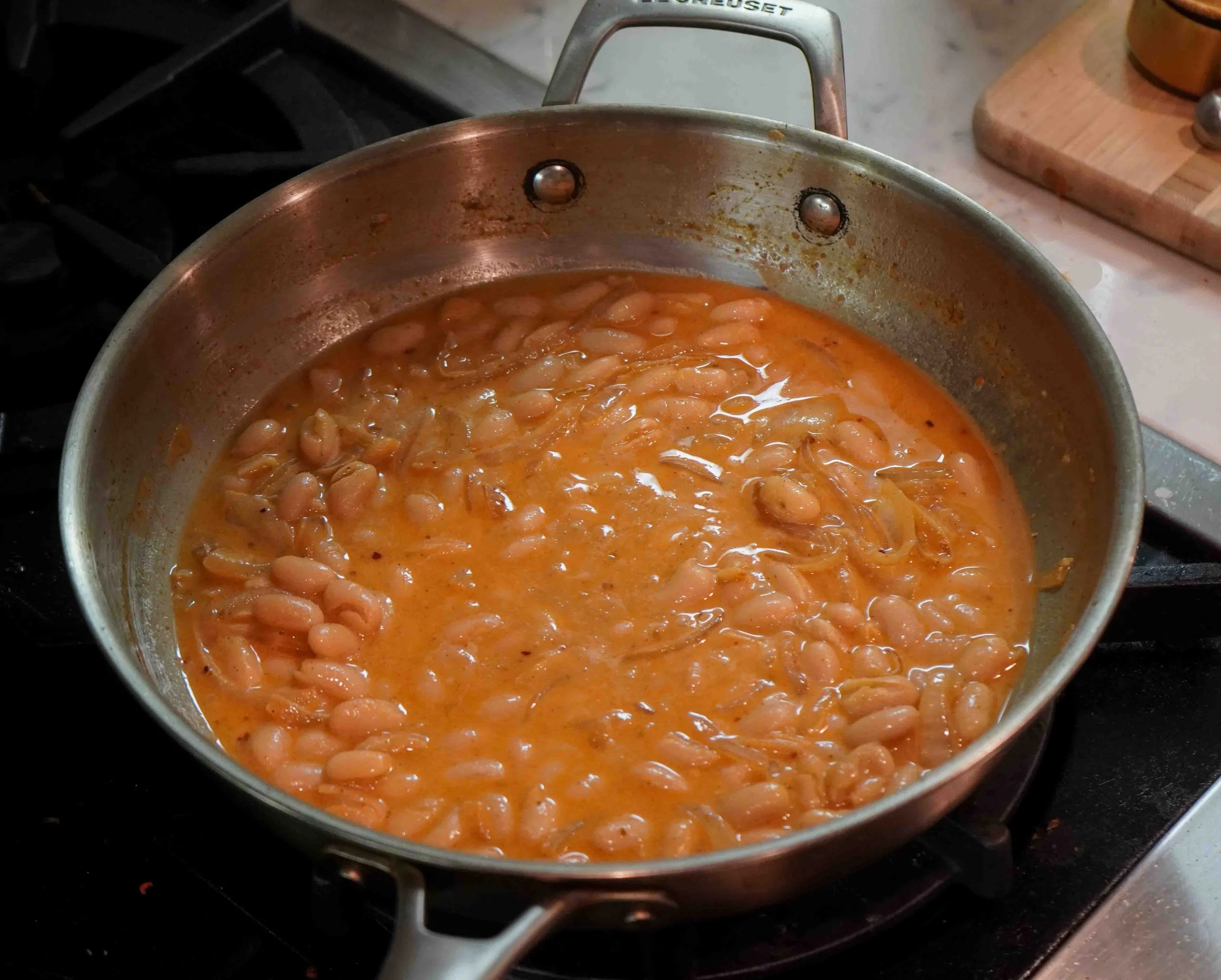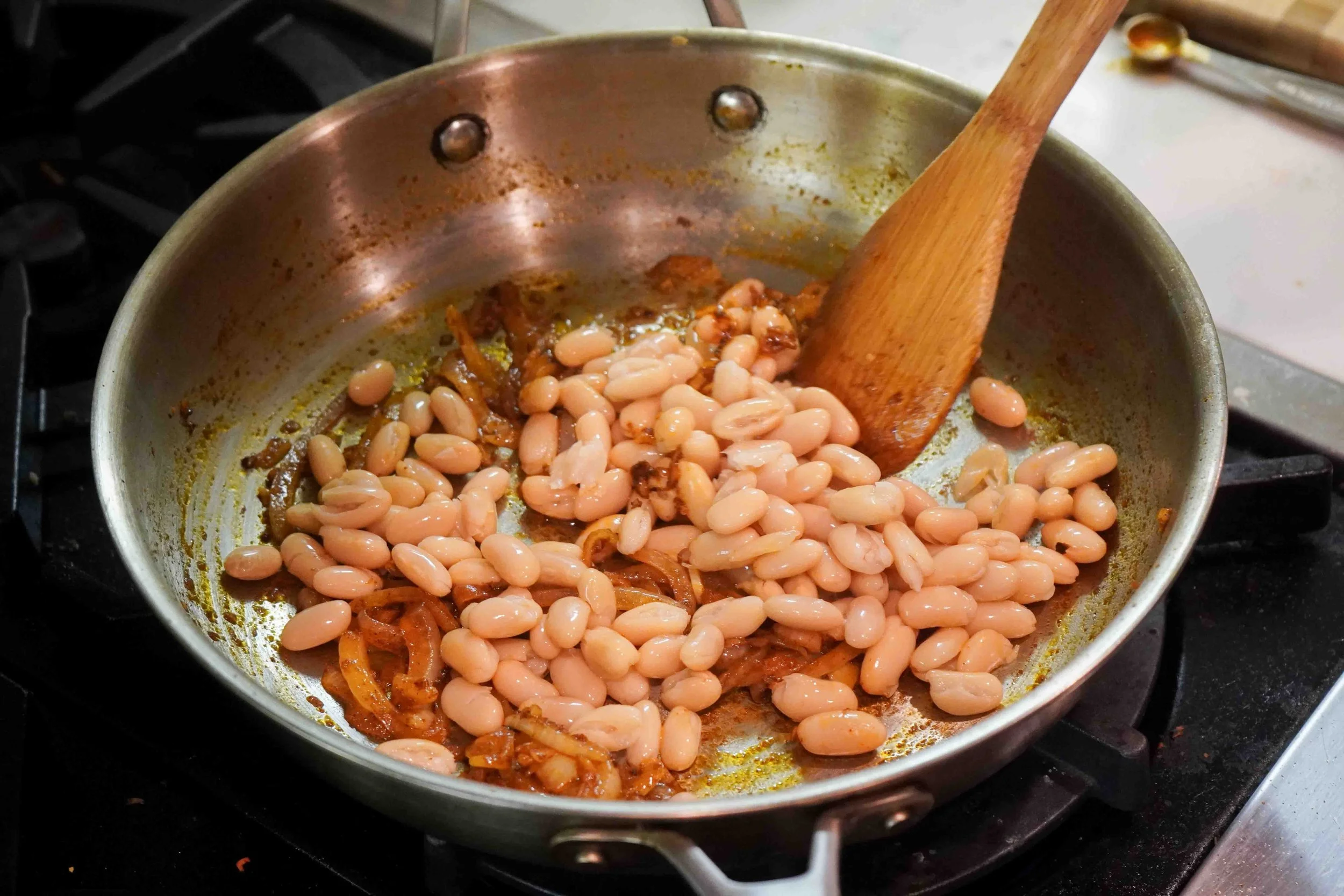 Once the onions are translucent and fragrant, add the beans to the pan and stir until they are all coated in seasoning. Add the remaining chicken broth, stir, then add the coconut milk (if using canned coconut milk, use the white fatty parts).