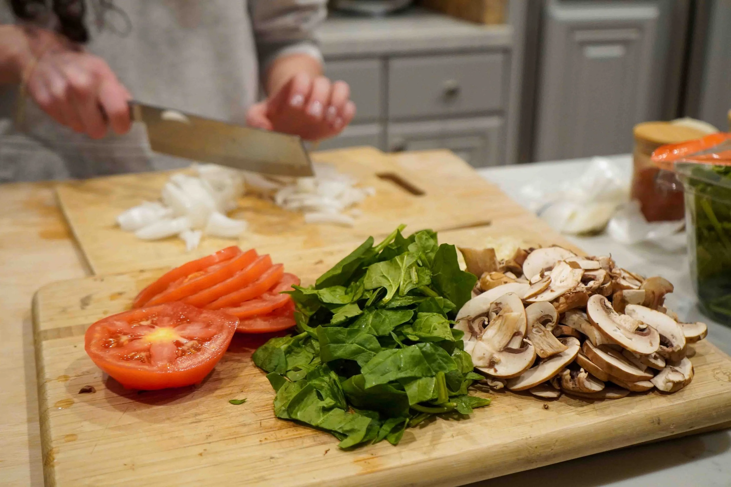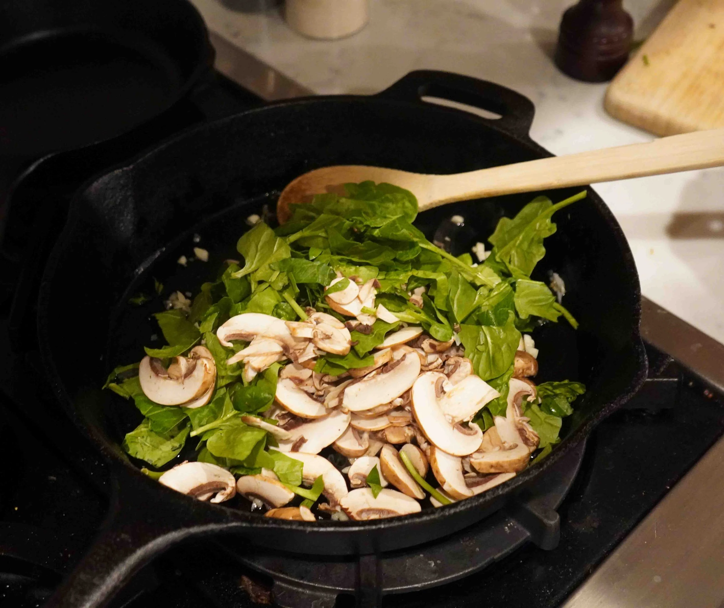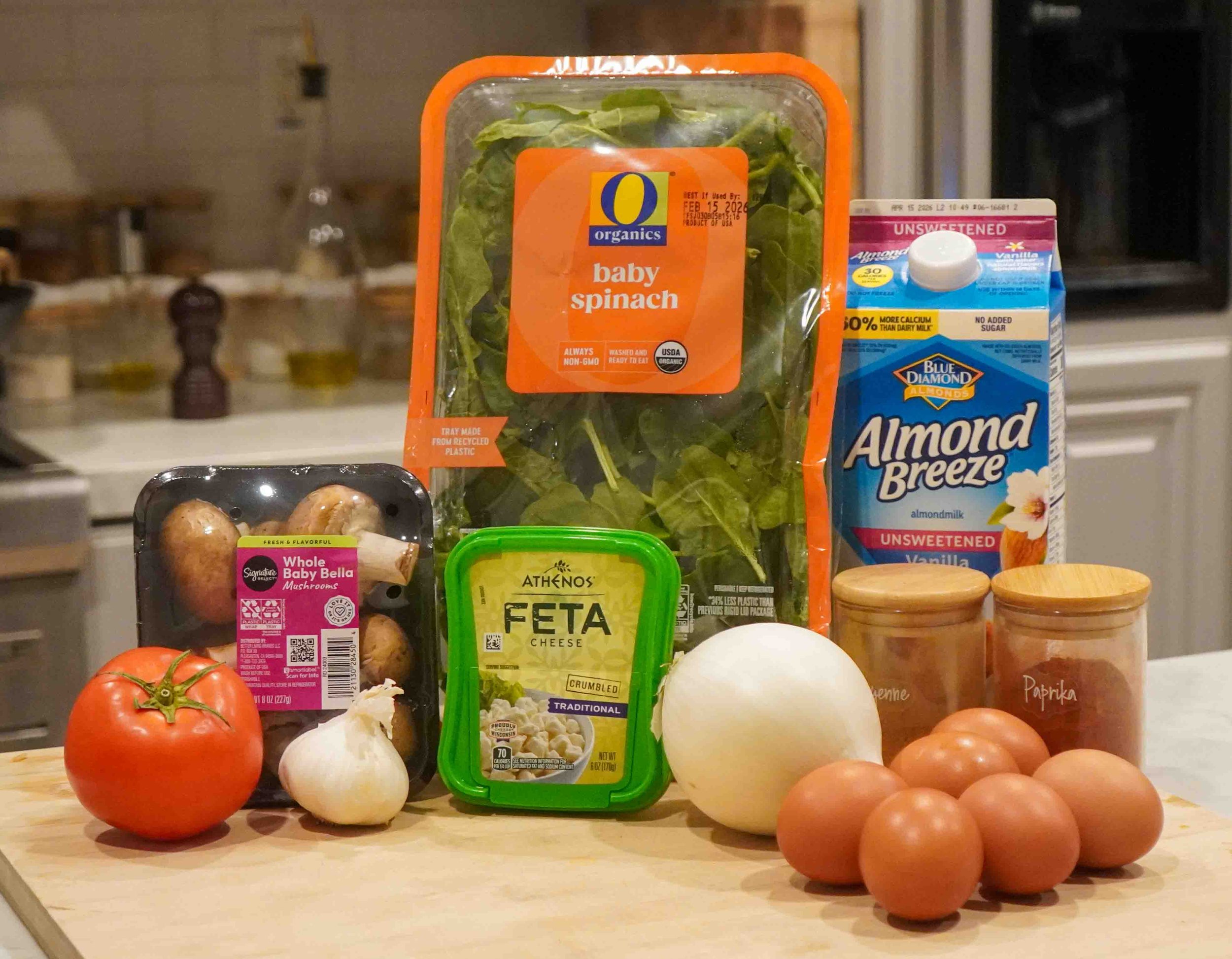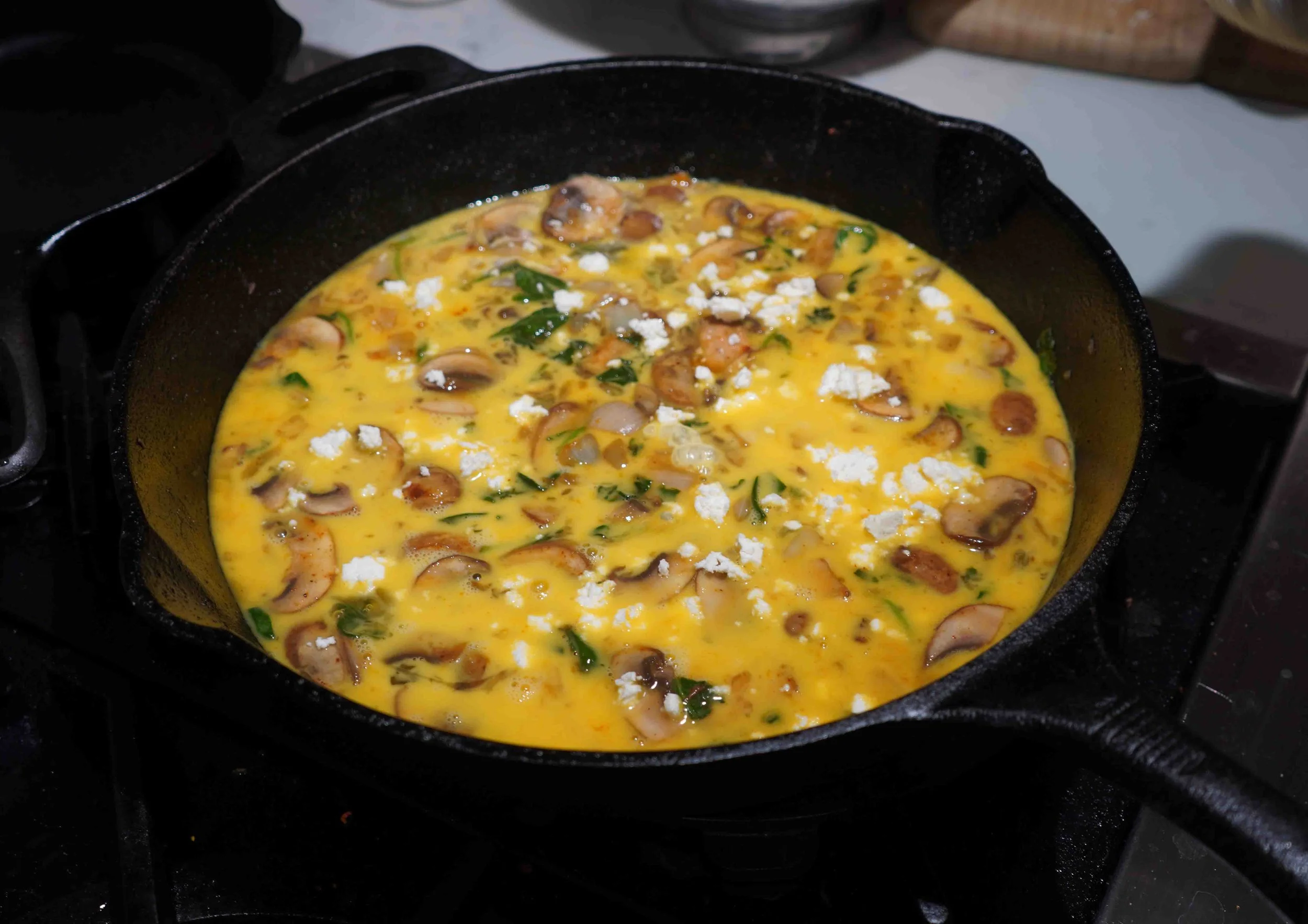 Preheat your oven to 400 degrees Fahrenheit. In a bowl, whisk together the eggs and milk. Heat a large cast-iron pan over medium heat, and once hot, add the olive oil. Sauté the garlic until fragrant (less than 1 minute) and add the spinach, onion, and mushrooms. Sauté everything until mushrooms are reduced in size, onions are translucent, and spinach is wilted. Finally, add the paprika, salt, pepper, and cayenne and mix.