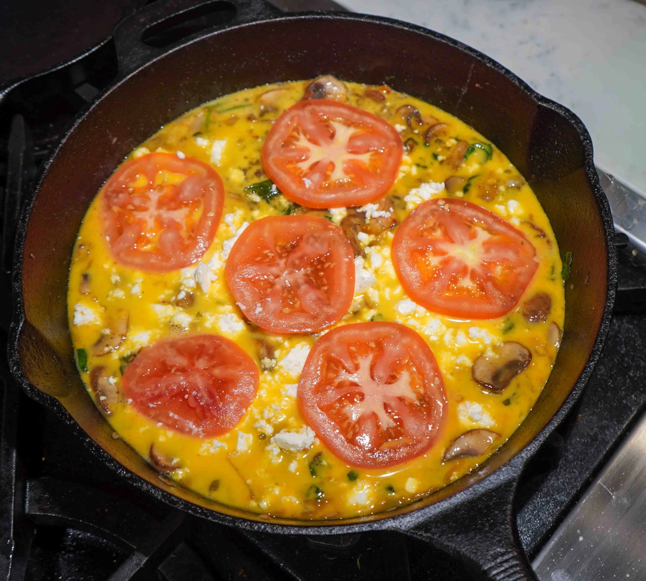 Lower the heat and spread the veggie mixture evenly across the pan, and add the egg mixture. Slightly wiggle your pan to distribute the egg. Top with the sliced tomatoes and crumbled feta. Place in the oven and cook for about 15 minutes.